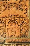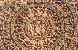 Unlike the temples and monuments built out of marble and stones brought from far-off places, the basic construction material for the Bishnupur temples was the local red soil. Out of the red clay terracotta tiles were made. On the tiles scenes from the the immortal Hindu epics like the Bhagawata, the Ramayana and the Mahabharata were artistically depicted. On structures raised with clay bricks tiles were fixed. The distinctive feature of the of the Bishnupur temples is that in their structural design they resemble the local huts.